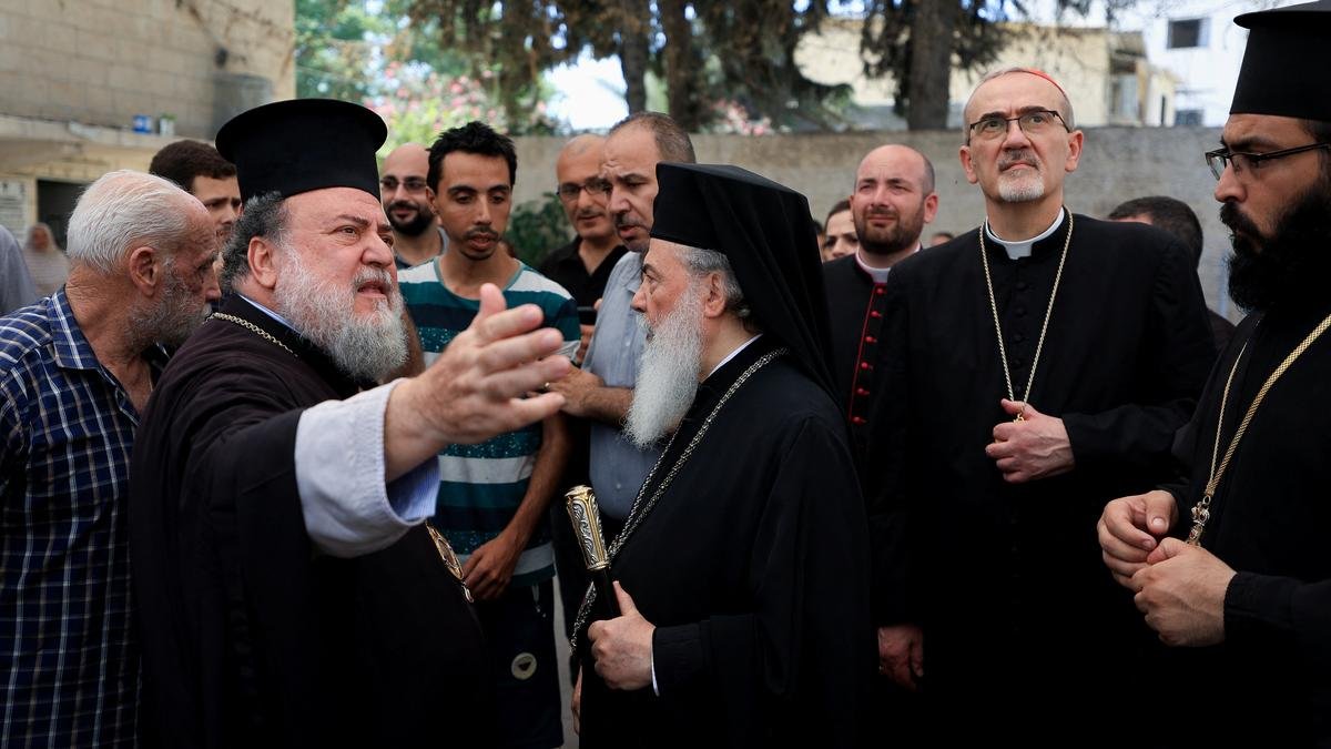 Latin Patriarch of Jerusalem Archbishop Pierbattista Pizzaballa, Greek Orthodox Patriarch of Jerusalem, Theophilos III, and Greek Orthodox Patriarchate Archbishop Alexios visit the Greek Orthodox Saint Porphyrius Church, in Gaza City July 18, 2025.