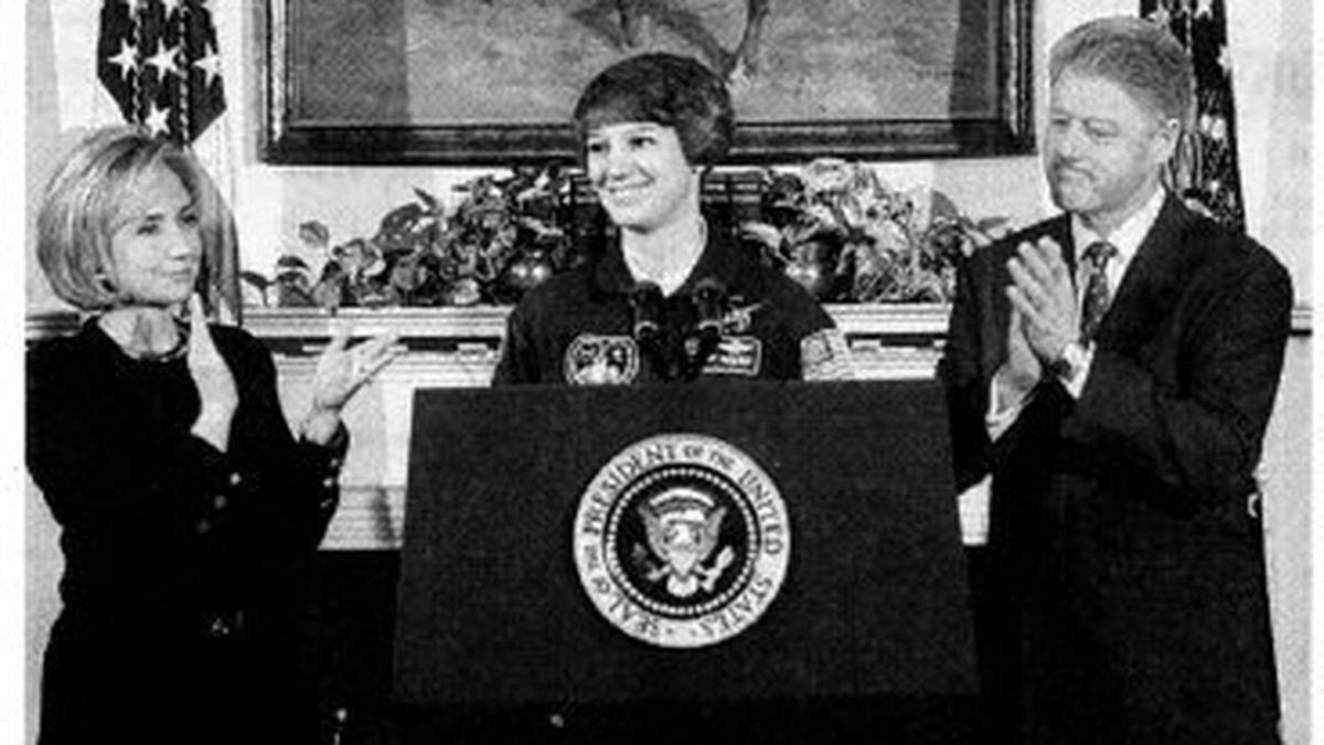 The U.S. President, Mr. Bill Clinton, and Mrs. Hillary Clinton, applaud the United States’ first woman to lead a mission into outer space, Ms. Eileen Collins, centre, at a White House ceremony. File