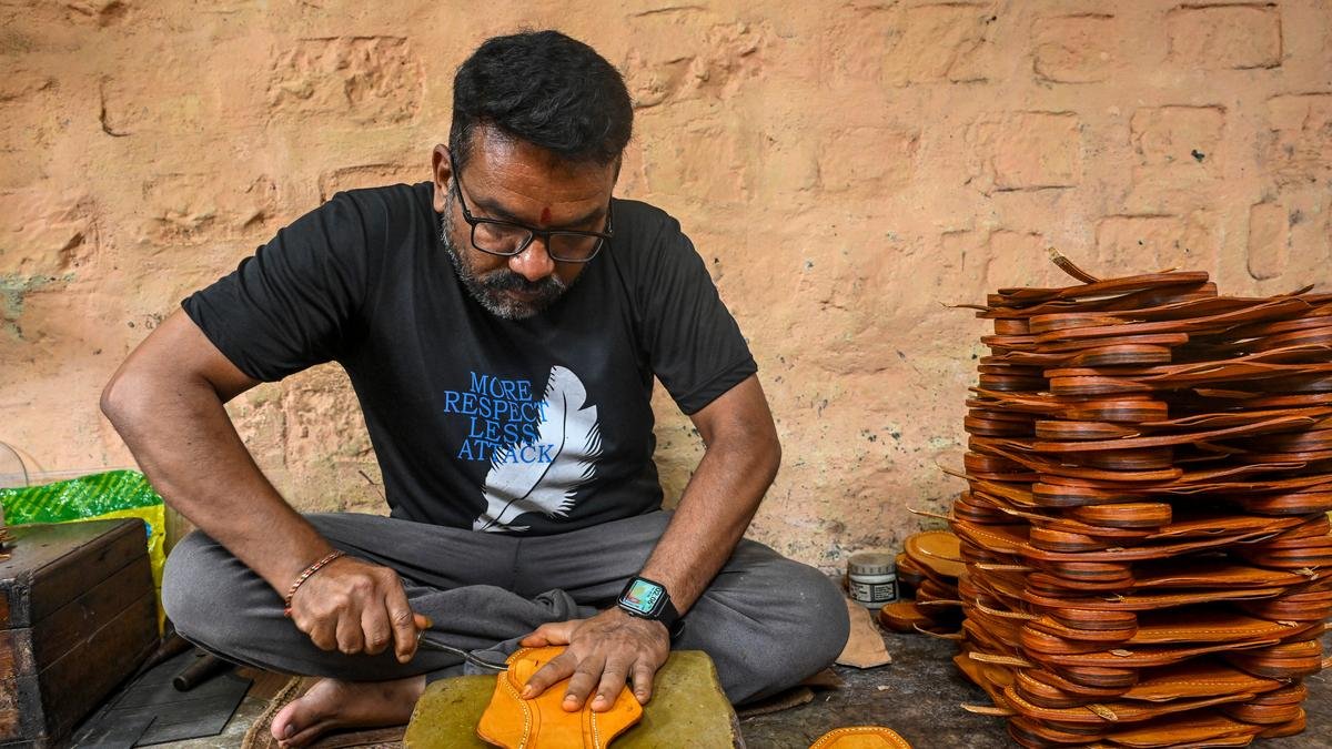 A man artisan does work on Kolhapuri at his residence in Kolhapur. File