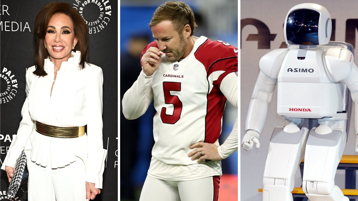 From left: Jeanine Pirro, NFL player Matt Prater sniffing … something, and a famous ambulatory robot.