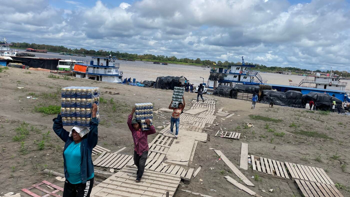Unloading boats at the dock at Leticia, Colombia, where the Amazon river has slowly retreated.