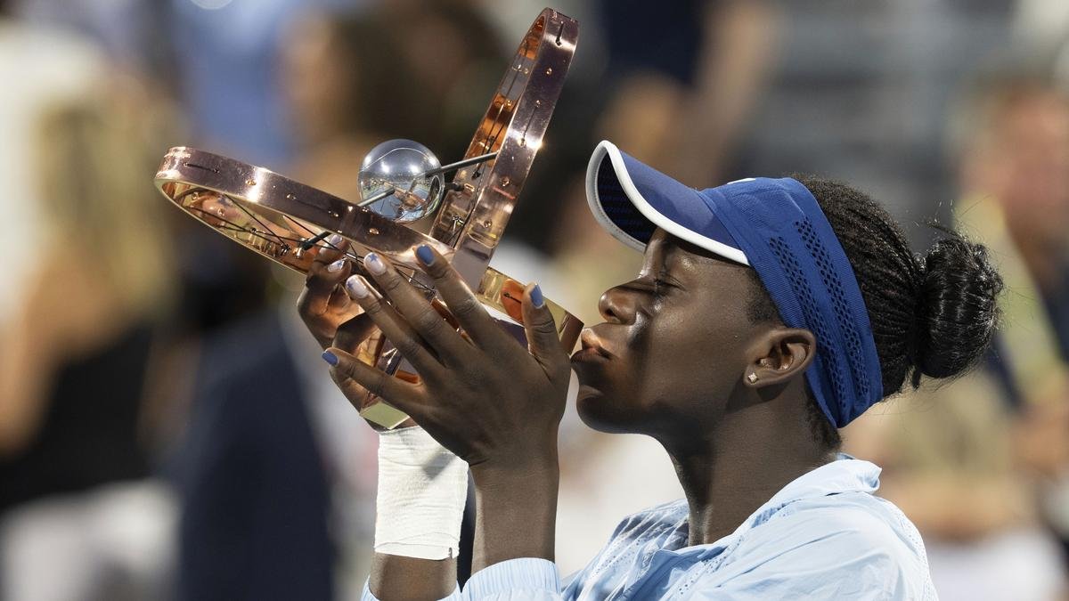 Victoria Mboko of Canada kisses the trophy following her win over Naomi Osaka of Japan during finals tennis action at the National Bank Open in Montreal, Thursday, Aug. 7, 2025.