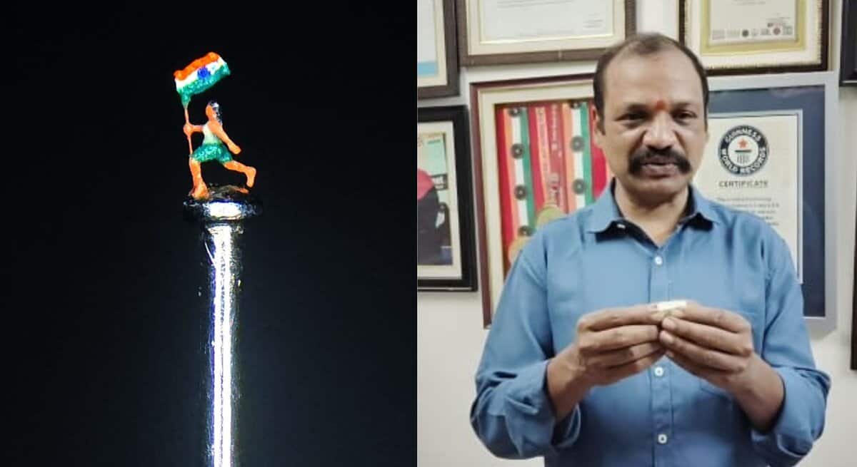 Hyderabad: Micro-artist Dr Gurram Dayakar from Jagtial district in Telangana added one more miniature statue to his list of masterpieces, by making a tiny statue of a woman in running position holding the national flag on the occasion of the 78th Independence Day celebrated on Friday, August 15.
