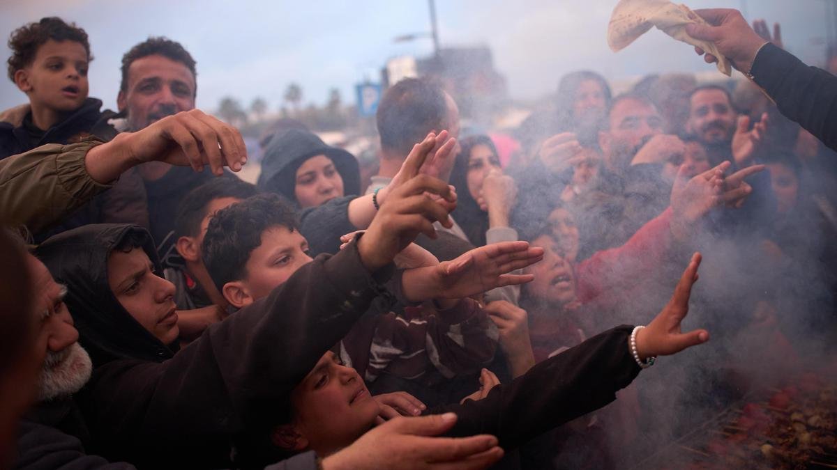 Displaced families extend their hands for donated food beside the tents they use as shelters after fleeing Israeli bombardment in southern Lebanon, in Beirut, Lebanon, Thursday, April 9, 2026.