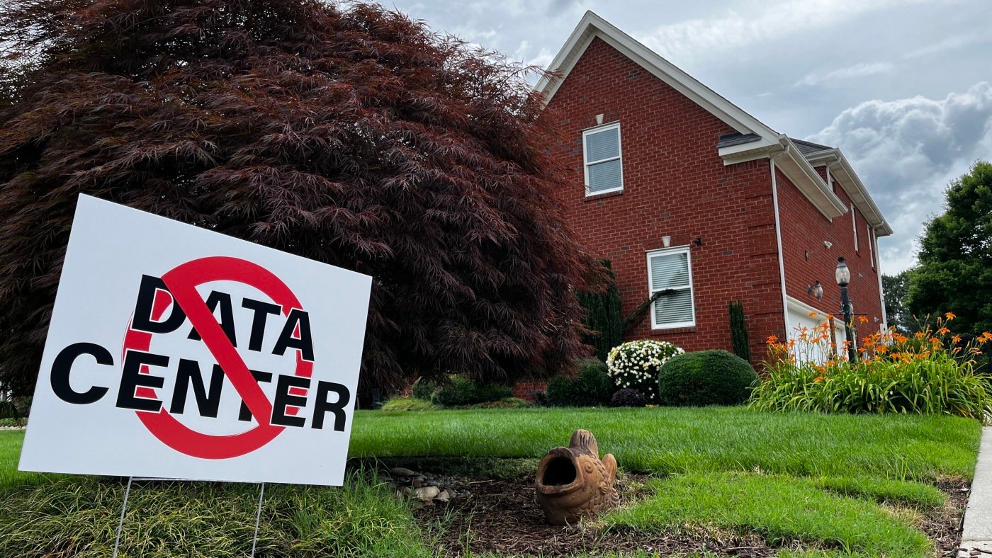 The yard of a house in Chesapeake, Va., displays a sign opposing the construction of data centers.