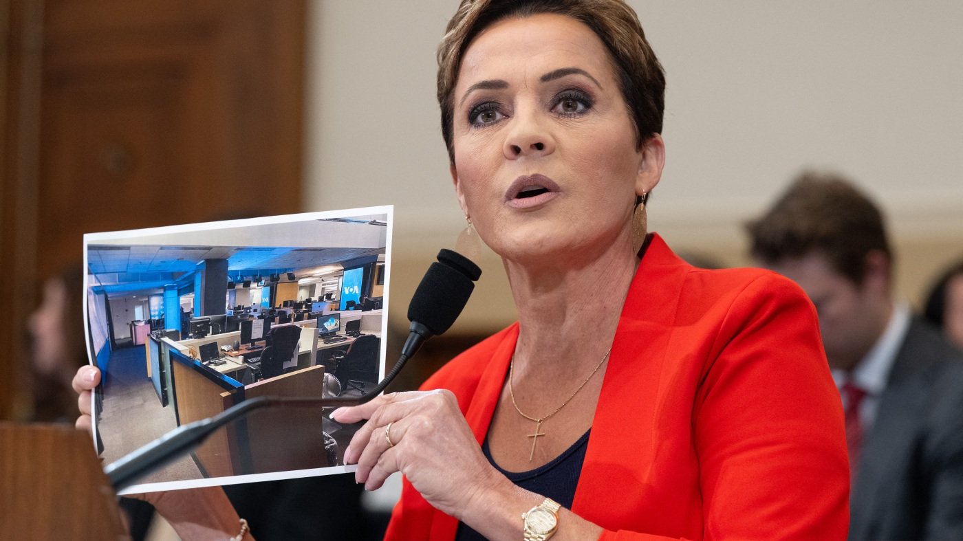 Kari Lake, who is overseeing the U.S. Agency for Global Media, holds up a photo of the Voice of America newsroom as she testifies during a House Foreign Affairs Committee hearing on the future of the agency on June 25, 2025.