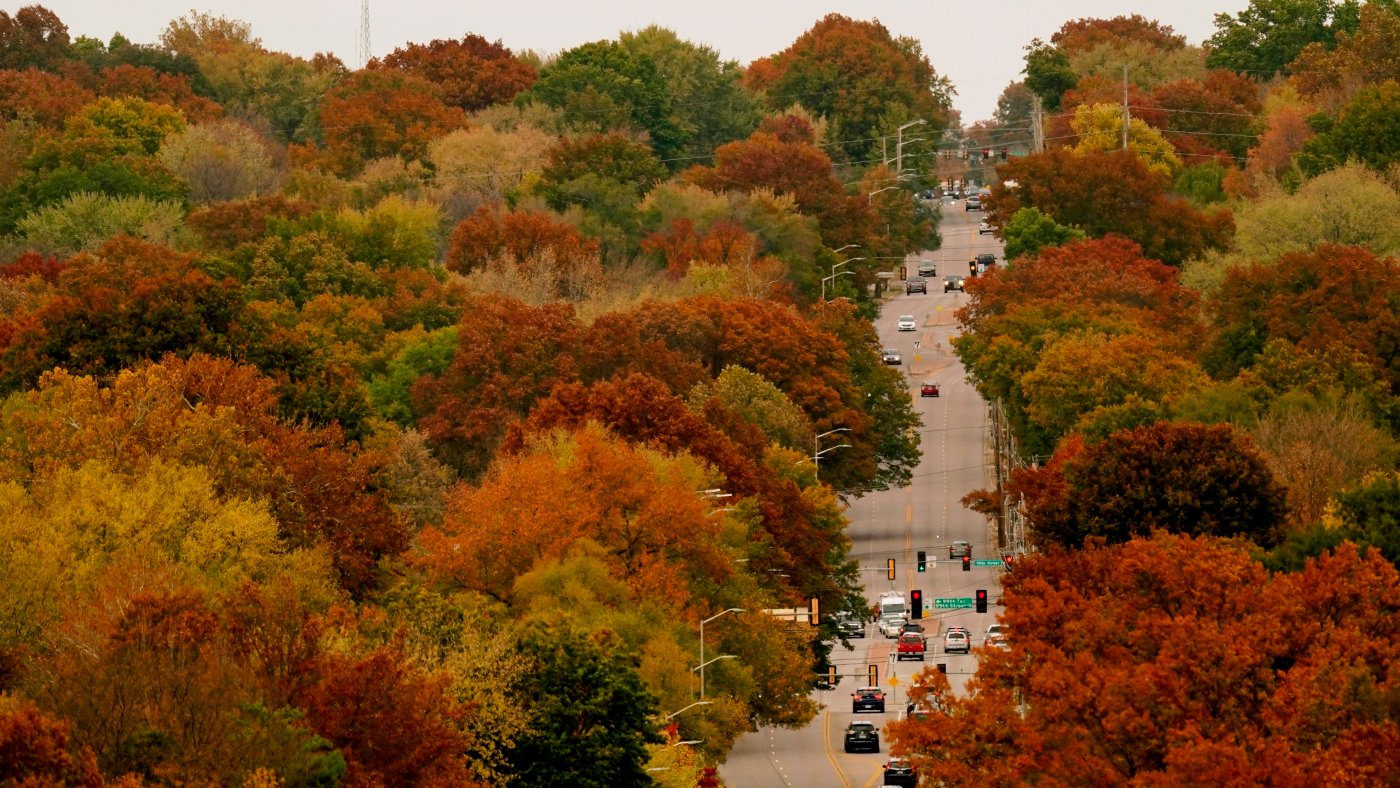 Trees displaying fall colors flank a roadway through neighborhoods in Overland Park, Kansas, Thursday, Oct. 27, 2022.