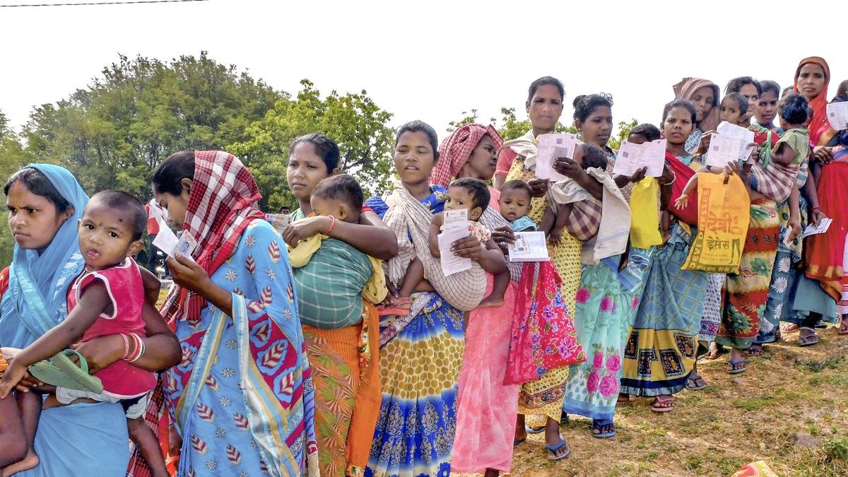 Tribal women voters stand in queues to cast their votes during the fourth phase of the Lok Sabha Polls, at Ulihatu in Khuti in 2024.