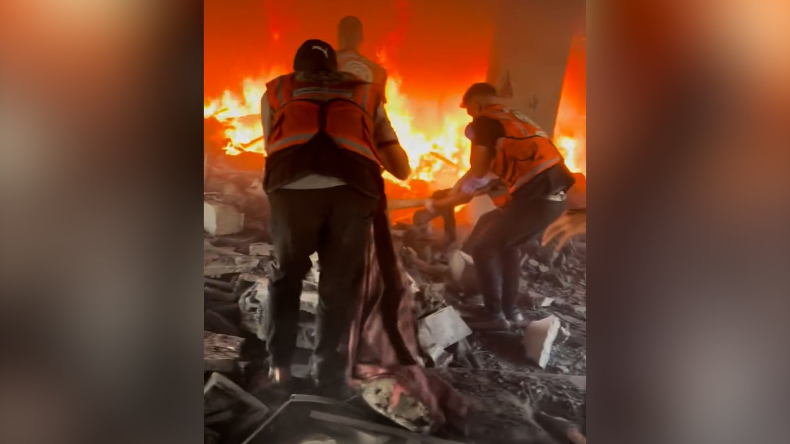 Video from a Palestinian defence volunteer shows the rescue of a woman from rubble and flames in Gaza City following an Israeli bombing of a building in Al-Zeitoun neighbourhood. The post says the woman is alive and in the hospital under medical supervision.
